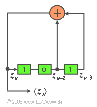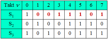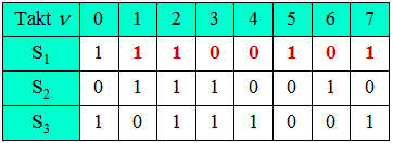 • Der letzte Vorschlag schließlich hätte zwar die gewünschte Periodenlänge  $P= 7$, aber aus der Modulo-2-Addition von  $S_2= 0$  und  $S_3= 1$  $($für  $\nu = 0)$  folgt zum nächsten Zeitpunkt  $(\nu = 1)$  zwingend:   $S_1= 1$.  Diese Eigenschaft zeigt die Folge 4 nicht.