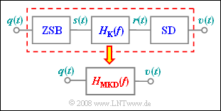 - Synchrondemodulator mit optimalen Kenngrößen, so dass das Sinkensignal $v(t)$ vollständig mit dem Quellensignal $q(t)$ übereinstimmt, wenn $H_{\rm K}(f) = 1$ ist (idealer Kanal).