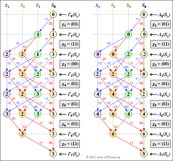 Die linke Grafik zeigt das endgültig ausgewertete ${\it \Gamma}_i(S_{\mu})$–Trellis.