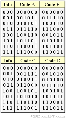 - Nur Code $\rm A$ und Code $\rm B$ sind identische Codes. Sie beinhalten genau die gleichen Codeworte und unterscheiden sich nur durch andere Zuordnungen $\underline{u} \rightarrow \underline{x}$.