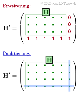 Ausgehend vom $(n, \, k)$–Code, dessen Prüfmatrix $\mathbf{H}$ gegeben ist, erhält man einen $(n+1, \, k)$–Code, indem man die Prüfmatrix um eine Zeile und eine Spalte erweitert und die neuen Matrixelemente entsprechend der oberen Grafik mit Nullen und Einsen ergänzt. Man fügt ein neues Prüfbit