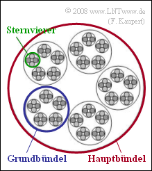 Bei ISDN  ("Integrated Services Digital Network")  ist der Endverzweiger  (in der Nähe des Teilnehmers)  mit einer Ortsvermittlungsstelle  $\rm (OVSt)$  durch eine Kupfer–Doppelader verbunden,  wobei jeweils zwei Doppeladern zu einem so genannten  "Sternvierer"  verdrillt sind.  Mehrere solcher Sternvierer sind dann zu einem  "Grundbündel" zusammengefasst,  und mehrere Grundbündel zu einem  "Hauptbündel" (siehe Grafik).