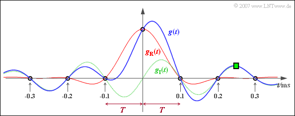 - $$g_{\rm R} ( t )= g_0 \cdot {\rm si} \left ( {\pi \cdot t}/{T}\right)\cdot {\rm si} \left ( {\pi \cdot 0.4 \cdot t}/{T}\right) \hspace{0.05cm}.$$