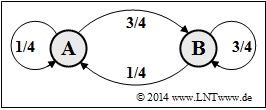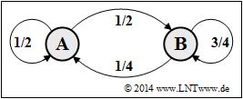 - $$p_{\rm A}= \frac{p}{p+q} = \frac{0.25}{0.25 + 0.50} \hspace{0.15cm} \underline {= 0.333} \hspace{0.05cm}, \hspace{0.5cm} p_{\rm B} = \frac{q}{p+q} = \frac{0.50}{0.25 + 0.50} \hspace{0.15cm} \underline {= 0.667} \hspace{0.05cm}.$$