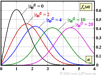 - $$f_a(a) = \frac{a}{\sigma^2} \cdot {\rm exp} [ -\frac{a^2 + |z_0|^2}{2\sigma^2}] \cdot {\rm I}_0 \left [ \frac{a \cdot |z_0|}{\sigma^2} \right ]\hspace{0.05cm}, \hspace{0.2cm}{\rm I }_0 (u) = \sum_{k = 0}^{\infty} \frac{ (u/2)^{2k}}{k! \cdot \Gamma (k+1)} \hspace{0.05cm}.$$