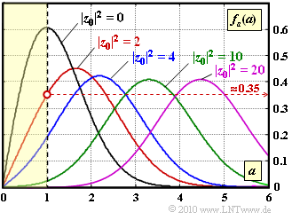 Es sei  $|z_0|^2 = 20$  (violette Kurve).  Wie groß ist  ${\rm Pr}(a ≤ 1)$?  Verwenden Sie die  Gaußnäherung.