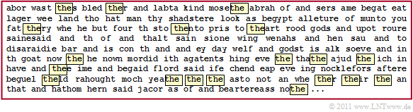 - Als dritter Buchstaben nach Leerzeichen und „t” folgt „h” mit fast $82\%$ und nach „th” ist „e” am wahrscheinlichsten $(62\%)$.