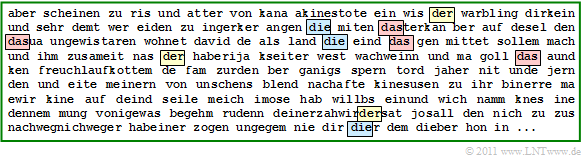 - Nach einem Leerzeichen (Wortanfang) folgt „t” mit $17.8\%$, während am Wortende (vor einem Leerzeichen) „t” nur mit der Häufigkeit $8.3\%$ auftritt.