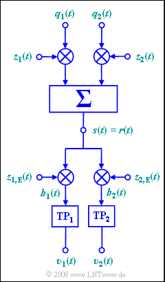 Die Multiplikation mit den empfängerseitigen Trägersignalen  $z_{1,\hspace{0.05cm}{\rm E}}(t)$  und  $z_{2,\hspace{0.05cm}{\rm E}}(t)$  und Bandbegrenzung führt zu den Signalen