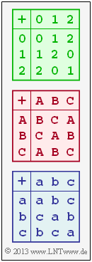 Die (rote) Additionstabelle ergibt sich aus der grünen Tabelle durch die Umbenennungen $0 → \rm C, \ 1 → A$ und $2 → \rm B$ und anschließende r $\rm ABC$–Sortierung.