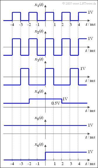 - Subtrahiert man vom Signal $x_5(t)$ den Gleichanteil $1\text{V}$, so ist das Restsignal $\Delta x_5(t) = x5(t) - 1\text{V}$ gleich Null.
