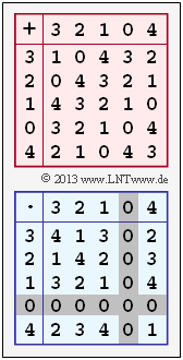 - Die Grafik zeigt die Additions– und die Multiplikationstabelle für diese Zahlenmenge.