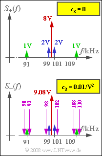$$c_3 \cdot z^3(t)= \frac{c_3 \cdot A_{\rm T}^3}{4} \cdot \left[ 3 \cdot \cos(\omega_{\rm T} t) + \cos(3\omega_{\rm T} t)\right] \hspace{0.05cm}.$$