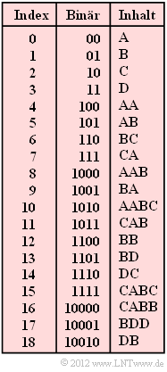 - Bereits zum Schritt $i = 2$ werden dagegen drei Bit benötigt. Hätte die Eingangsfolge mit AAA begonnen, so hätte die LZW–Codierung $I_2 = I(i = 2)$ den Dezimalwert $4$ ergeben. Dieser ist nicht mehr mit zwei Bit darstellbar und muss mit drei Bit codiert werden, ebenso wie $I_3$, $I_4$ und $I_5$.