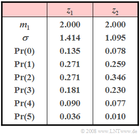 - $${\rm Pr}(z_1 = 6)=\frac{2^6}{6!}\cdot e^{-2}\hspace{0.15cm} \underline{\approx 0.012}$$