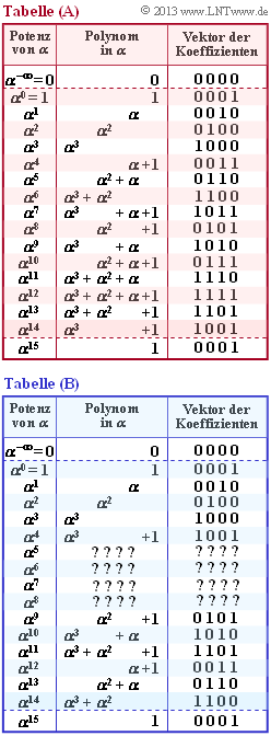 • In der Teilaufgabe  (3)  sollen Sie zudem die fehlenden Potenzen  $\alpha^5, \ \alpha^6, \ \alpha^7$  und  $\alpha^8$  in der Tabelle  $\rm (B)$  ergänzen.