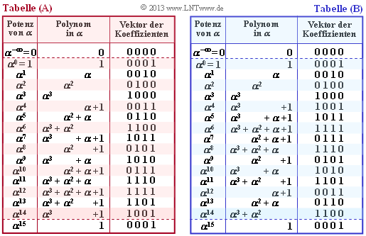 • Nicht angegeben wird,  ob sich die Tabellen  $\rm (A)$  und  $\rm (B)$  aus dem Polynom   $p_1(x) = x^4 + x + 1$   oder aus   $p_2(x) =x^4 + x^3 + 1$   ergibt.  Diese Zuordnungen sollen Sie in den Teilaufgaben  (1)  und  (2)  treffen.