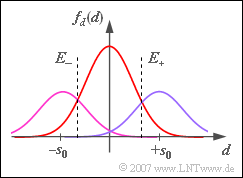 - Dafür soll durch Variation der Entscheiderschwellen $E_{–}$ und $E_+$ die Symbolfehlerwahrscheinlichkeit $p_{\rm S}$ minimiert werden.