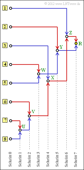 - (c) Zuordnung der Symbole $\rm A$, ... , $\rm H$ zu den entsprechenden Huffman–Binärfolgen. Eine rote Verbindung entspricht einer 1, eine blaue Verbindung einer 0.