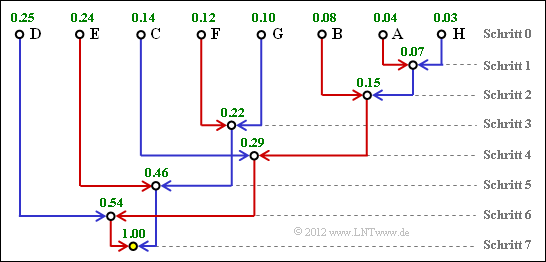 - Da die zwei unwahrscheinlichsten Symbole schon im ersten Schritt zusammengefasst werden, nehmen die Auftrittswahrscheinlichkeiten von oben nach unten ab