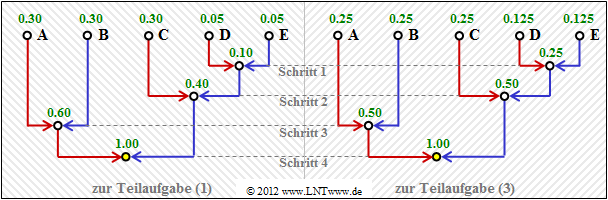 $\rm A$ → 11, $\rm B$ → 10, $\rm C$ → 01, $\rm D$ → 001, $\rm E$ → 000. - Die linke Grafik gilt für die Wahrscheinlichkeiten gemäß Teilaufgabe (1).