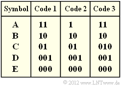 In obiger Grafik sind drei Codes vorgegeben. Sie sollen entscheiden, welche dieser Codes durch Anwendung des Huffman–Algorithmus entstanden sind (oder sein könnten).