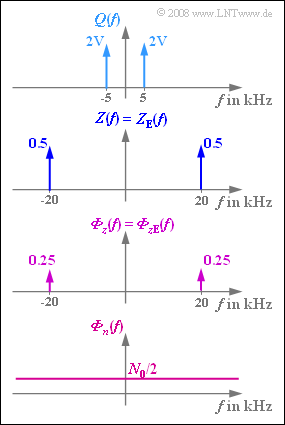 In der Grafik sind diese Vorgaben im Spektralbereich dargestellt. Ausdrücklich soll erwähnt werden, dass sich das Leistungsdichtespektrum ${\it Φ}_z(f)$ der Cosinusschwingung $z(t)$ ebenso wie das Amplitudenspektrum $Z(f)$ aus zwei Diraclinien bei $±f_{\rm T}$ zusammensetzt, aber mit dem Gewicht $A^2/4$ anstelle von $A/2$. Die Amplitude ist bei dieser Aufgabe stets $A=1$ zu setzen.