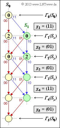 Anhand dieser Darstellung soll die Viterbi–Decodierung schrittweise nachvollzogen werde, wobei von der folgenden Empfangssequenz auszugehen ist: $\underline{y} = (11, \, 01, \, 01, \, 11, \, 01)$.