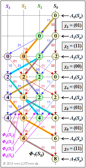 - Eindeutig findet man den überlebenden Pfad durch Rückwärtssuche, also vom Knoten ${\it \Lambda}_7(S_0)$ zum Knoten ${\it \Lambda}_0(S_0)$.