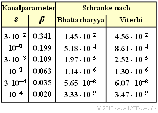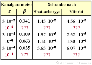 - Für noch größere $\beta$–Werte wird die Bhattacharyya–Schranke negativ und auch das Ergebnis für die Viterbi–Schranke ist dann nicht anwendbar. Daraus folgt: