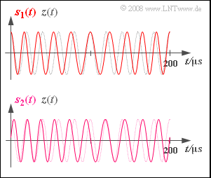 - Das Signal $s_2(t)$ unterscheidet sich von $s_1(t)$ möglicherweise durch eine andere Nachrichtenphase $ϕ_{\rm N}$ und einen anderen Modulationsindex $η$. Alle anderen Systemparameter sind gegenüber $s_1(t)$ unverändert.