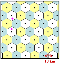 - Schwarze Punkte kennzeichnen Basisstationen, die in diesem Modell im Abstand von $D = 10 \ \rm km$ gleichmäßig verteilt sind.