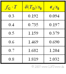 Die Tabelle zeigt die Augenöffnung $\ddot{o}(T_{\rm D})$ sowie den Detektionsrauscheffektivwert $\sigma_{\rm d}$ – jeweils normiert auf die Sendeamplitude $s_0$ – für verschiedene Grenzfrequenzen $f_{\rm G}$. Die Grenzfrequenz ist so zu wählen, dass die ungünstigste Fehlerwahrscheinlichkeit möglichst klein ist, wobei folgende Definition gilt: