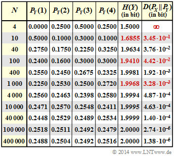 - $$\Rightarrow \hspace{0.3cm} D(P_X \hspace{0.05cm}|| \hspace{0.05cm} P_Y) = \frac{1}{4 \cdot {\rm lg} \hspace{0.1cm}(2)} \cdot \left [ {\rm lg} \hspace{0.1cm} \frac{0.25^4}{P_Y(1) \cdot P_Y(2)\cdot P_Y(3)\cdot P_Y(4)} \right ] \hspace{0.05cm}.$$