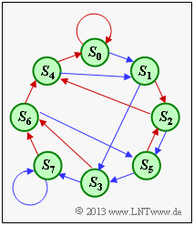 (3) Vom Zustand $S_1$ ⇒ $u_{i–1} = 1, \ u_{i–2} = 0, \ u_{i–3} = 0$ kommt man mit $u_i = 0$ (roter Pfeil) zum Zustand $S_2$. Dagegen landet man mit $u_i = 1$ (blauer Pfeil) beim Zustand $S_3$ ⇒ $u_{i–1} = 1, \ u_{i–2} = 1, \ u_{i–3} = 0$.
