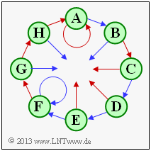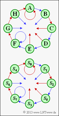 In obiger Grafik sind allerdings für die Zustände $S_0, \, \text{...} \, , \, S_7$ Platzhalter names $\mathbf{A}, \, \text{...} \, , \, \mathbf{H}$ verwendet. In den Teilaufgaben (1) und (2) sollen Sie klären, welcher Platzhalter für welchen Zustand steht.