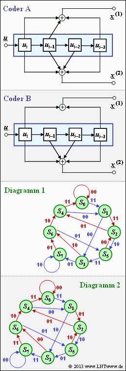 - zwei unterschiedliche $\text{ Coder A }$ und $\text{ Coder B}$, jeweils mit dem Gedächtnis $m = 3$ (oben),