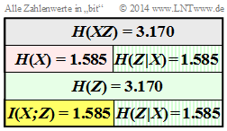 - Die Entropie $H(Z)$ ist gleich der Verbundentropie $H(XY) = 3.170 \ \rm bit$.