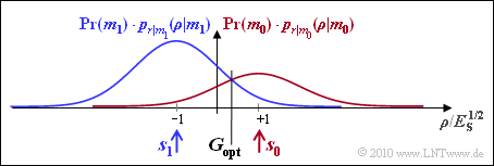 - Die optimale Entscheidergrenze ist demnach nach rechts $($hin zum unwahrscheinlicheren Symbol $s_0)$ verschoben, wegen ${\rm Pr}(m_0) < {\rm Pr}(m_1)$.