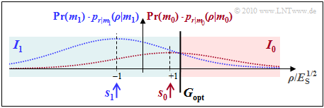 so dass die optimale Entscheidergrenze nun bei $G_{\rm opt} = \underline {1.4 \cdot s_0}$ liegt. - Somit gehört der (ungestörte) Signalwert $s_0$ nicht zur Entscheidungsregion $I_0$, sondern zu $I_1$, gekennzeichnet durch $\rho < G_{\rm opt}$.