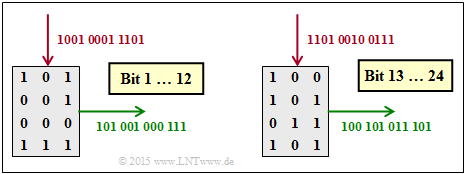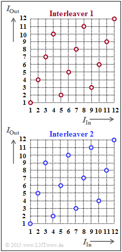 Rechts sind zwei Interleaver angegeben und zwar in grafischer Form durch die Zuordnung $I_{\rm Out}(I_{\rm In})$. Diese Größen stehen für den „Index der Ausgangsfolge” bzw. für den „Index der Eingangsfolge”. Es gilt: