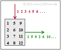 Bei Block–Interleaving füllt man eine Matrix mit $S$ Spalten und $Z$ Zeilen spaltenweise und liest die Matrix zeilenweise aus. Damit wird ein Informationsblock mit $I_{\rm max} = S \cdot Z$ Bit deterministisch verwürfelt.
