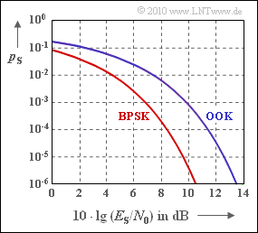 Hier werden die Fehlerwahrscheinlichkeiten  $p_{\rm S}$  von den digitalen Modulationsverfahren  "On–Off–Keying"  $\rm (OOK)$  und  "Binary Phase Shift Keying"  $\rm (BPSK)$  ohne Herleitung angegeben.
