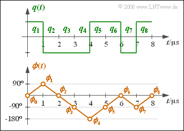 (4) Die Grafik zeigt die MSK–Phase $ϕ(t)$ zusammen mit dem Quellensignal $q(t)$. Man erkennt: