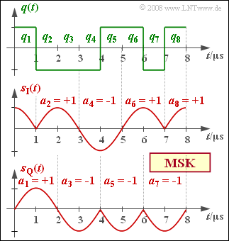 Die Grafik zeigt unten die beiden äquivalenten Tiefpass–Signale $s_{\rm I}(t)$ und $s_{\rm Q}(t)$ in den beiden Zweigen, die sich nach der Umcodierung $a_k = (-1)^{k+1} \cdot a_{k-1} \cdot q_k $ aus dem oben skizzierten Quellensignal $q(t)$ für den Inphase– und den Quadraturzweig ergeben. Berücksichtigt ist hierbei der MSK–Grundimpuls