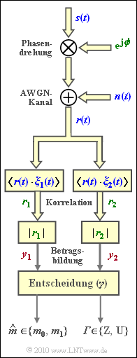 Die Grafik zeigt im unteren Bereich den nichtkohärenten Demodulator für binäres  "Frequency Shift Keying"  $\rm (BFSK)$.  Alle komplexen Signale sind blau beschriftet,  komplexe Werte grün und reelle Werte rot.