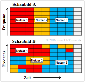 Die Grafik zeigt zwei Schaubilder $\rm A$ und $\rm B$ mit beispielhaften Frequenz–Zeit–Belegungen. Sie sollen entscheiden, welche Zugriffsverfahren durch diese beiden Schaubilder erklärt werden sollen.