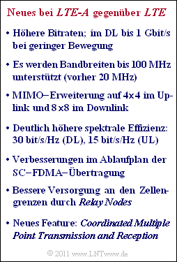 - In obiger Grafik sind einige der Neuerungen beim Übergang von LTE auf LTE–A zusammengestellt.