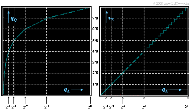 - Dieser Rechengang ist anhand der Grafik nachvollziehbar. Obwohl die Expanderkennlinie $v_E(υ_{\rm Q})$ gleich der Umkehrfunktion der Kompressorkennlinie $q_K(q_{\rm A})$ ist, ergibt sich ein Fehler, da die Eingangsgröße $v_{\rm Q}$ des Expanders wertdiskret ist (Einfluss der Quantisierung).
