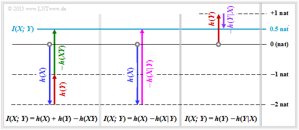 - $$I(X;Y) = h(X) + h(Y) - h(XY) = -2 \,{\rm nat} + 1 \,{\rm nat} - (-1.5 \,{\rm nat} ) \hspace{0.15cm}\underline{= 0.5\,{\rm nat}}\hspace{0.05cm}.$$